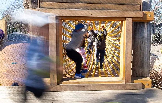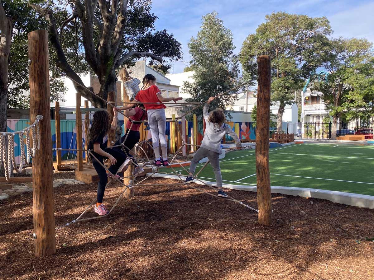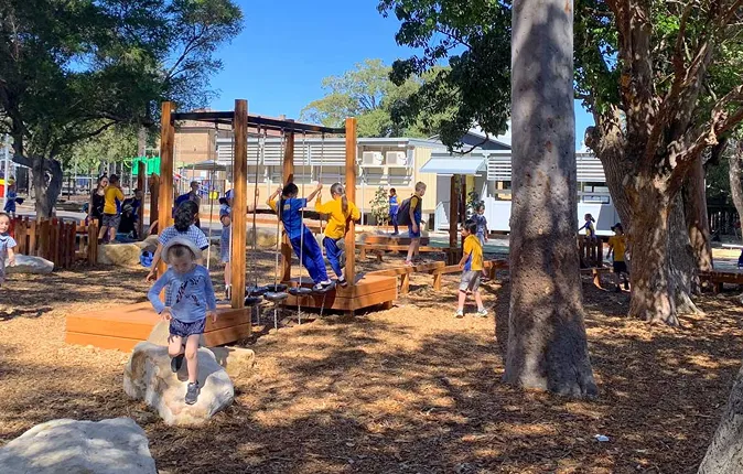 Bespoke playground codesigned with students, maximising space through mature trees for active, imaginative play.